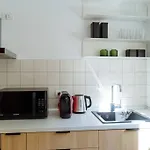 Поряд з кавоваркою, в апартаментах є кухня, обладнана мікрохвильовою піччю, електрочайником і холодильником.